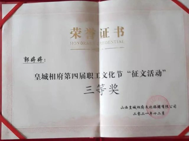 记录一份舒爽心情 捕捉一幅美好画卷 今天我们与你分享 皇城相府生态文化旅游区 第四届职工文化节 优秀征文展 (三等奖) 郭婷婷: 生态农业区办公室工作,热爱生活,性格开朗,稳重,有较强的团队合作意识和集体荣誉感;在生活中严于律己、勤于动手,具有开拓进取、务实、永不放弃的坚强品质...