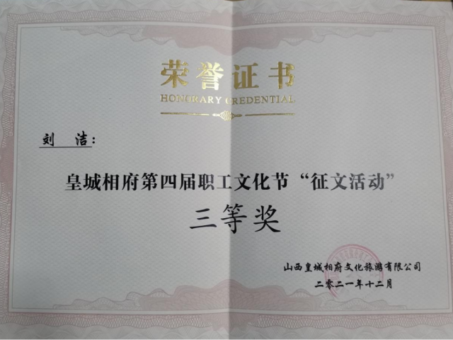 记录一份舒爽心情 捕捉一幅美好画卷 今天我们与你分享 皇城相府生态文化旅游区 第四届职工文化节 获奖征文展 (三等奖) 2 刘洁: 大家好,我叫刘洁,是来自九女仙湖景区的一名导游。我大学毕业于建筑装饰工程技术专业,在学生时代,我可以尽情的在知识的海洋里翱翔;现在在景区,我可以在历...