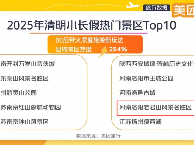 清明小长假落幕 美团旅行数据新鲜出炉 老君山 上榜国内热门景区Top10 全国十大热门景区中,洛阳独占3席!而老君山更是以绝美云海、金顶日出、沉浸式互动演绎场景等特色强势登榜,成为中原山水顶流! 清明假期期间 栾川人气爆棚 老君山景区持续火爆 老君山仙山花海节如期开幕,在中...
