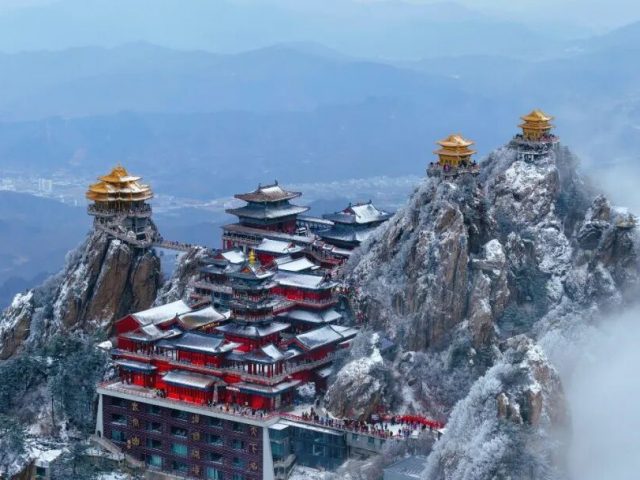 一场不期而至的雪花飘落老君山 将这座山装点得如诗如画 银装素裹的山峦 晶莹剔透的雾凇 云海翻腾的奇观 雪后的老君山,宛如人间仙境 美得让人窒息 被雪覆盖的老君山 有着平日难得一见的绝美风光 金殿在翻滚的云海中若隐若现 古朴的道观建筑在白雪映衬下更显静谧庄严 恍若天宫瑶台 奇峰怪石...