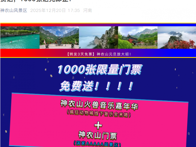 神农山元旦 火兽音乐嘉年华 2026年1月1日-2日,狂欢开启 进入倒计时 家人们!敲黑板!划重点! 更关键的是—— 转发3天免费领票的活动, 也同步进入倒计时! 截止到2025年12月31日, 就剩最后几天时间! 1000张免费门票, 含景区门票+音乐嘉年华入场券, 先到先得,...