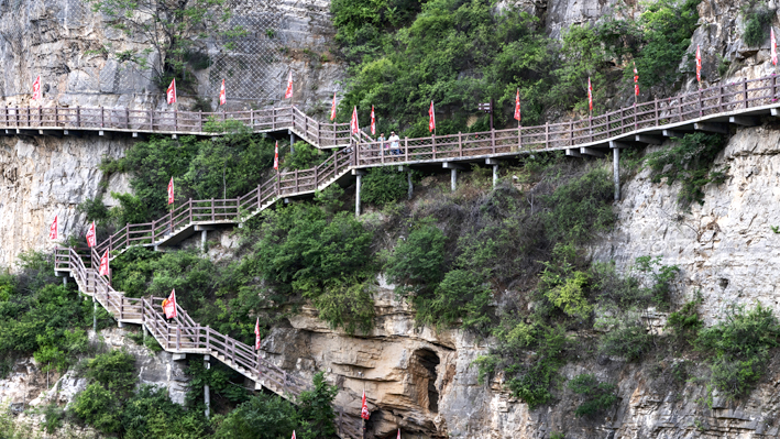 景区的玻璃吊桥,是河南全省跨度最大的玻璃桥,桥体总长度为300米,宽度为2.4米,垂直高度为116米,吊桥主体风格以红色为主,象征富贵吉祥,为纪念这个世界上最伟大母亲的厚爱和慈祥,所以这座桥取名——外婆桥。