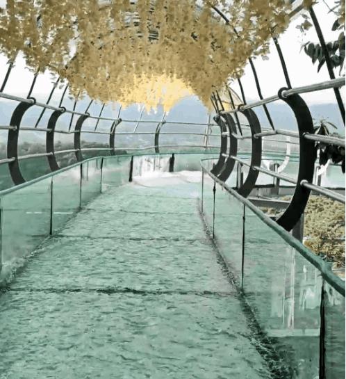 漫步在夜晚的玻璃桥上,眼观七彩灯光