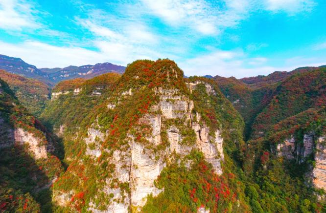 因九路寨景区原始森林浩瀚,山峦峡谷壮观。奇峰与幽谷相为映衬,飞瀑与林海相伴生辉,因此九路寨总是碧波如洗,蓝天可见,白云悠悠。