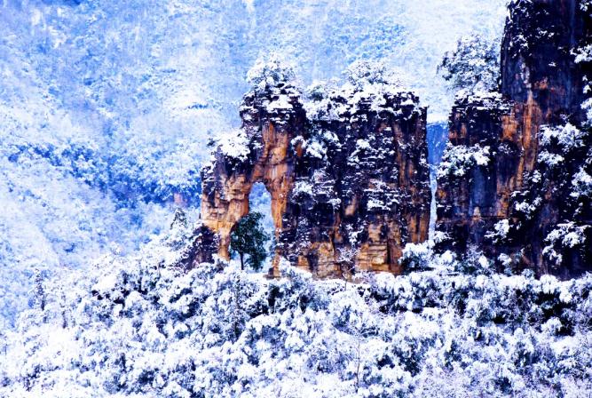 放眼望去,满世界的银装素裹;近观其景,眼前一切都是美轮美奂。无论是那挺拔的大树还是那俊俏的山峰,亦或是优雅的溪流,全换上了洁白的婚纱。