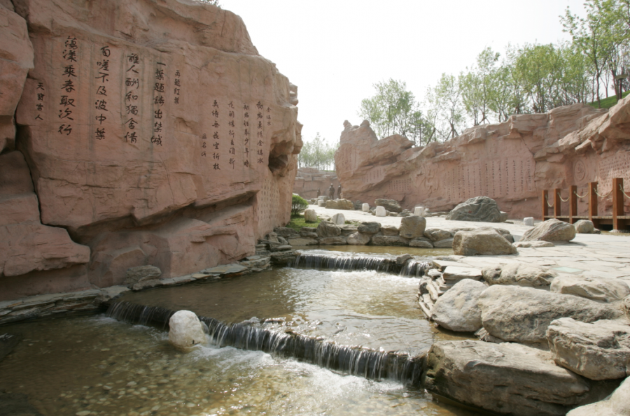 这里按照陕北的红砂岩建造而成,总长度120米,峡谷的平均高度为45米,最高处7米,共有人物形象20个。“唐诗峡”围绕诗歌内容及著名诗人的活动典故,组成了13组故事情景,与壁刻唐诗名篇57首穿插呼应,如《红叶题诗》、《长恨歌》、《滕王阁序》等。