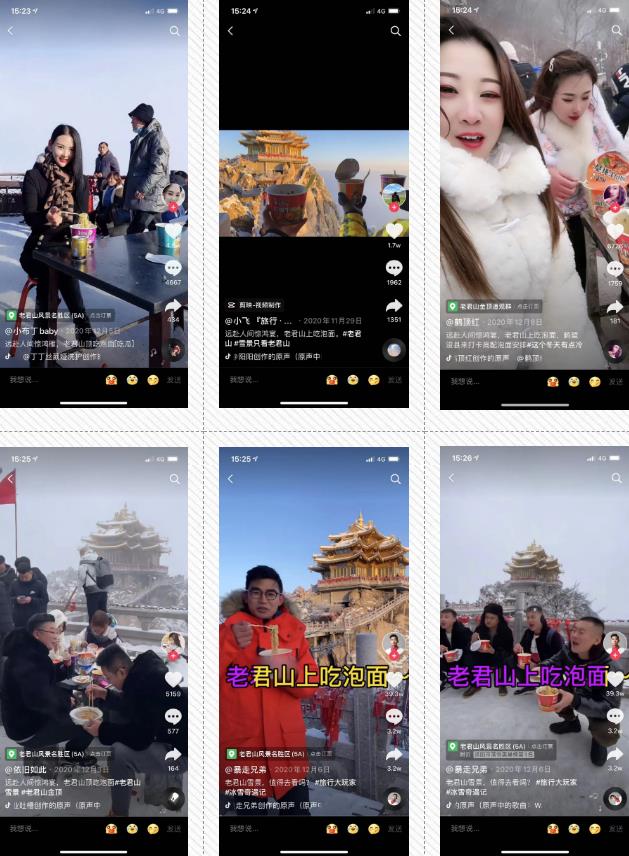 一时间,“远赴人间惊鸿宴、老君山顶吃泡面”成为了网友的热门打卡项目,每天都有数以万计的游客以及网红、大V奔赴而来,他们冒着寒风登顶,欣赏老君山惊艳雪景的同时,端一碗热腾腾的泡面与金殿合个影,才算圆满完成自己远道而来的打卡目标。