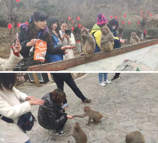 意外的是途径猴园时,多只猕猴已经在必经之路上等着踩线团。这些调皮的家伙知道客人带的有零食或者干果,于是提前“越狱“等着这里。大家看见这些“小逃犯”们欣喜不已,纷纷递上自己带的干果;吃饱喝足的小猴子们十分温顺,大家纷纷跟它们合影互动。