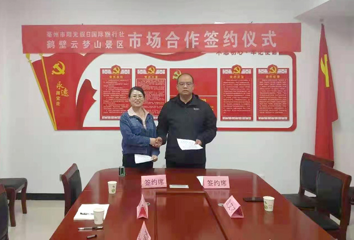 亳州阳光假日国际旅行社总经理张丽红与淇县旅游发展服务中心副主任、云梦山景区总经理郭海涛签署了市场合作协议,双方就省际游客团队市场合作展开了深度交流。此次签约,标志着云梦山景区进一步拓宽与加强安徽省旅游市场开发,双方将发挥各自优势扩大合作空间,共同开拓业务合作新领域!