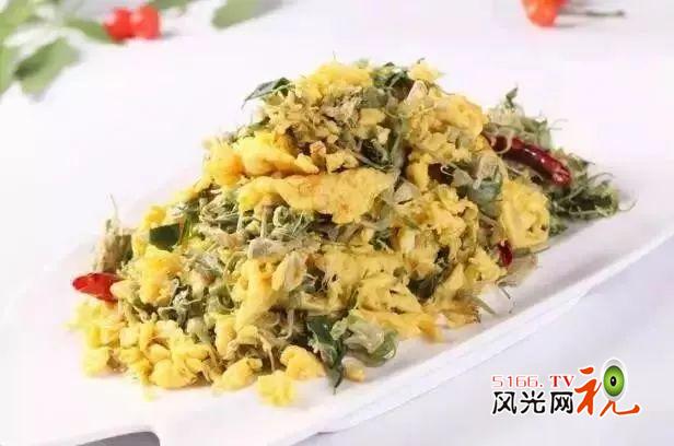 3、炒锅置旺火上,放少许油烧热,倒入槐花蛋液。