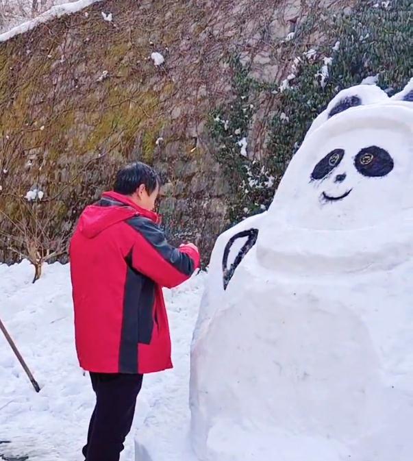 尧山索道技工华师傅忙碌了四个小时,终于,雪雕作品——“冰墩墩之尧山分墩”新鲜出炉。