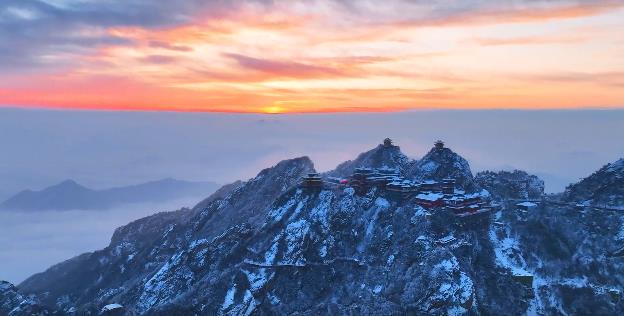 1月2日,雪后初晴的老君山,日出、云海、雪景与金殿相互辉映,显得整座大山格外美丽,置身其中仿佛误入了天宫。