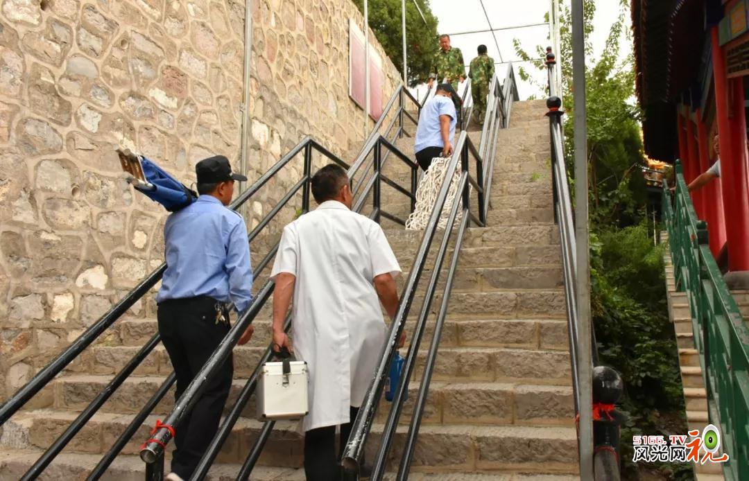 6月5日上午 9:00,应急演练正式开始,珏山索道遭遇机械故障,一辆缆车中的两名游客被悬挂在半空中,乘客情绪很不稳定,请求紧急救援!现场工作人员立即上报应急救援指挥部,指挥部迅速启动救援预案,成立现场指挥部,景区紧急救援大队、医疗急救等多支救援队伍迅速携带装备赶到现场,对被困游客进行营救。