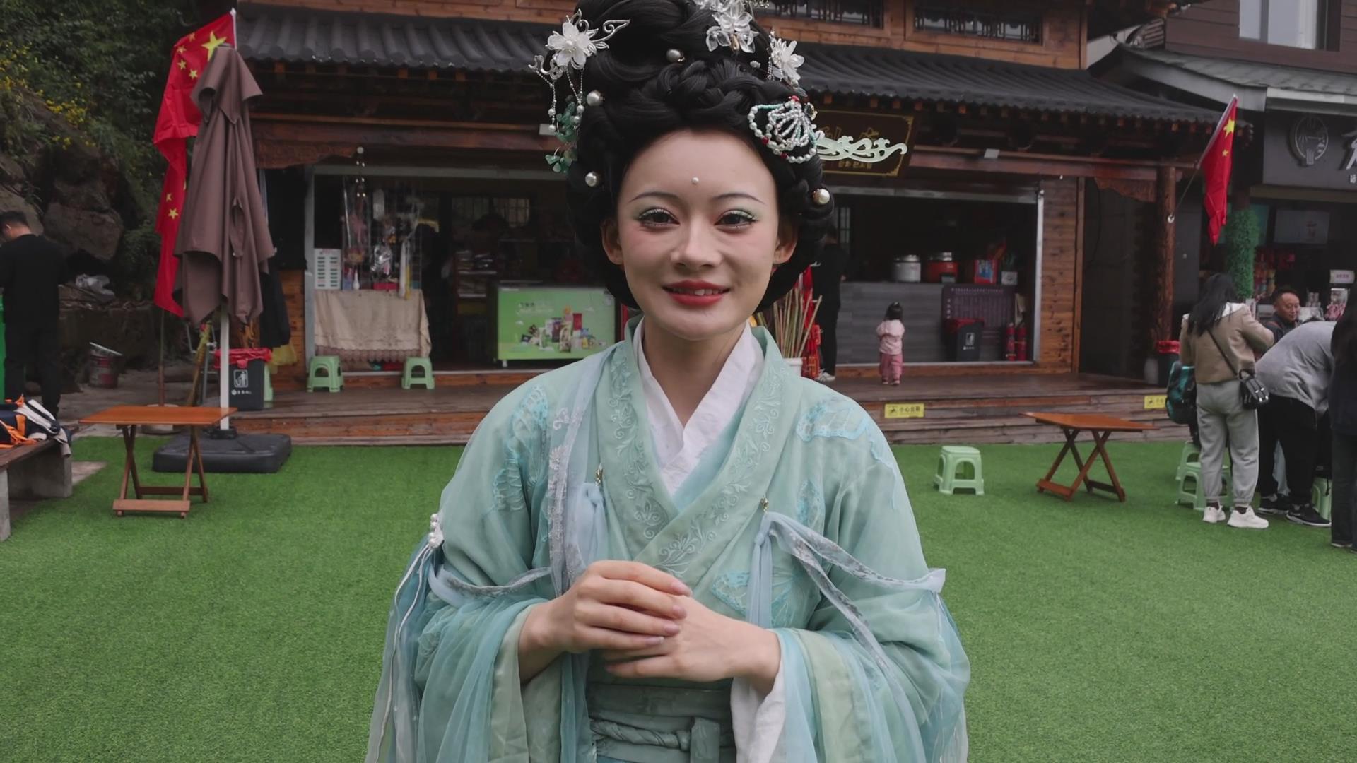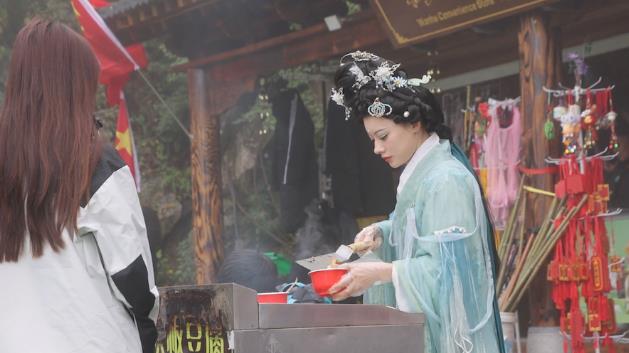 2023年9月29日,中秋国庆长假首日,河南洛阳老君山景区,一名经常在小贩所在的广场演出的小姐姐在帮助小贩烤栾川豆腐,而她经常扮演的角色恰巧就是西施。