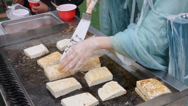 虽然小姐姐烤豆腐手法略显生涩,但是看得出她却是非常认真,一丝不苟的在铁板上按照流程烤着豆腐,让人顿生好感。