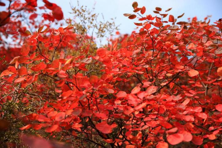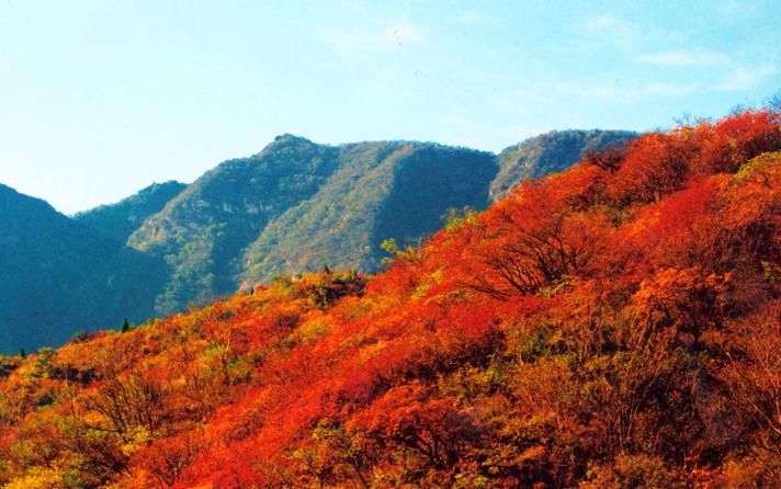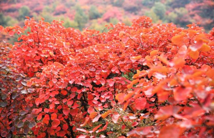 “香山红叶、北方之最、嵩山红叶、中原醉美”。在嵩山,三皇寨与少林寺接连交臂,生态自然环境,地质地貌独具一格,以”峰奇-路险-石怪-景秀”著称。这里的红叶区观赏面积达20多平方公里,品种丰富,色彩鲜艳,为中原地区最大的红叶林带,也被称为中原第一红,中原醉美红叶。此次嵩山与少林联动,“嵩山看日出,少林观日落”,当黄栌与日光交汇,万山红遍,层林尽染,百般景物堪图画。