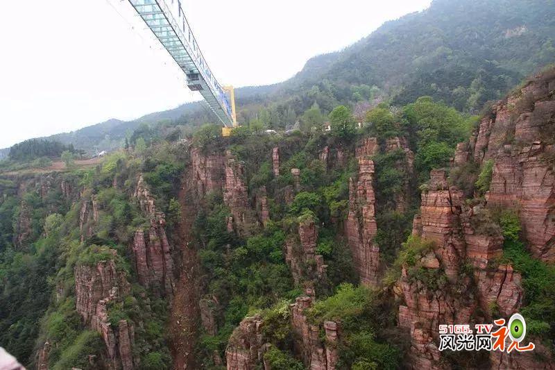 玻璃桥悬于红石峰丛之间,两峰地势险峻、崖壁陡直,中间裂谷横穿。风和日丽之时,踏在玻璃桥上,轿顶山峡谷裂隙尽收眼底,行走其上仿如御风而行,惊险无比,云深雾重之际,于桥上悬空赏景如漫步云端,如若“云中天桥”。置身于峡谷天堑以独特角度感受轿顶山丹霞奇观。