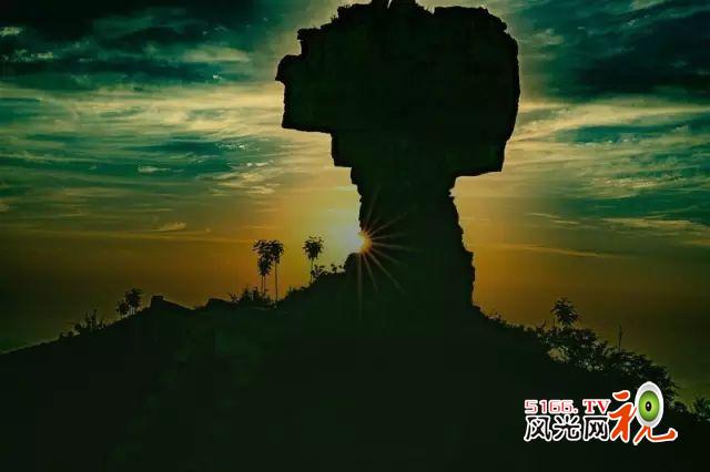 在巍峨的轿顶山上有一块巨型华盖奇石,它屹立于天地之间,经千百万年的侵蚀、风华的交互作用逐渐形成令人赞叹的天下奇观,宛若神灵,从天际款款而来。