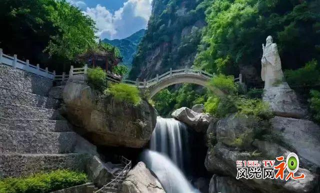 飞虹瀑位于十里峡景区。飞瀑从高处跌落,如白虹惊落,似飞玉人间,滔滔流水如春花秋月般直面人前,至落崖处又如遥挂彩虹般洒然而下,溅起的水花如粒粒珍玉,阳光照射,水面上方惊现多道彩虹,妩媚秀丽,缭绕人间。在此处徘徊,伴着夏日的清风,感受随风吹来的瀑布雨雾,仿佛置身凉爽的天然浴场。