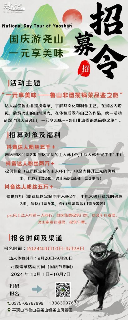 1.要根据景区要求发布景区视频,题材风格不限,时长不低于15秒,需带景区统一活动话题(“国庆游尧山,一元享美味——鲁山非遗揽锅菜品鉴之旅”@云上尧山)