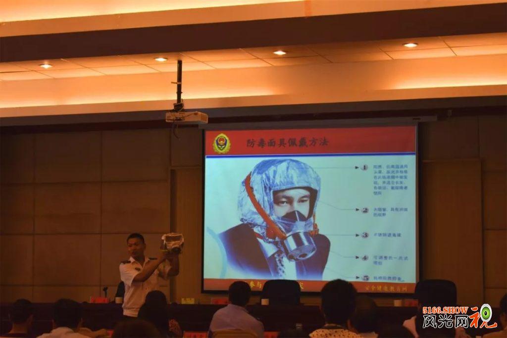詹教官向大家演示了防毒面具的佩戴步骤及注意事项。他强调,正确佩戴防烟面具可以大幅提升火场逃生的几率。