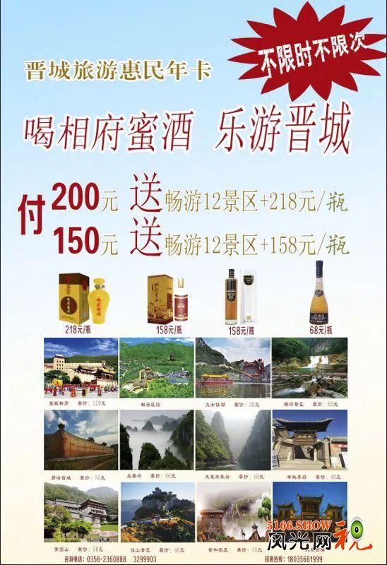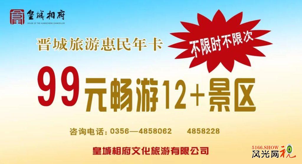皇城相府5A级景区、相府庄园、九女仙湖、蟒河、王莽岭、郭峪古城、凤凰欢乐谷、布政李府、珏山、大阳古镇、智和农庄、黄围山等12家景区头道门票。门票挂牌价合计525元。年卡注册之日起13个月有效。 服务热线:0356-48580620356-4858228 关注“皇城相府生态文化旅游区“微信公众号后,找到并转发此条微信,即有机会获得九女仙湖水上乐园或相府庄园玻璃天桥门票一张。(6月30日至7月1日凭晋城旅游惠民年卡领取门票,网上购买的电子年卡除外)。 转载请注明来源:风光网视 » 晋城旅游惠民年卡,即将震撼面世!