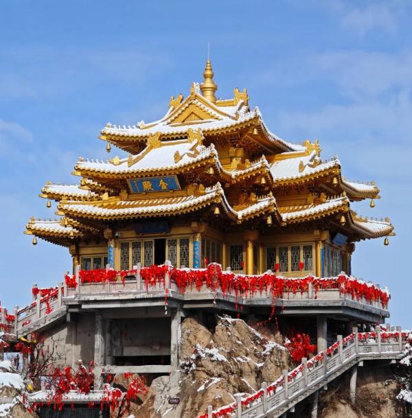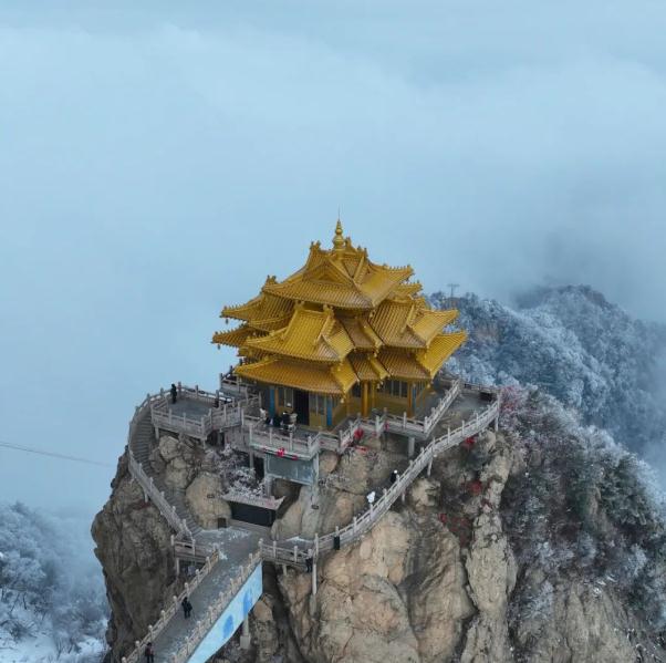 那金顶群落,在雪与云海的映衬下,更显庄严肃穆又不失灵动之美。飞檐斗拱上的积雪,仿佛是历史与自然的深情相拥,每一砖一瓦都诉说着岁月的故事。