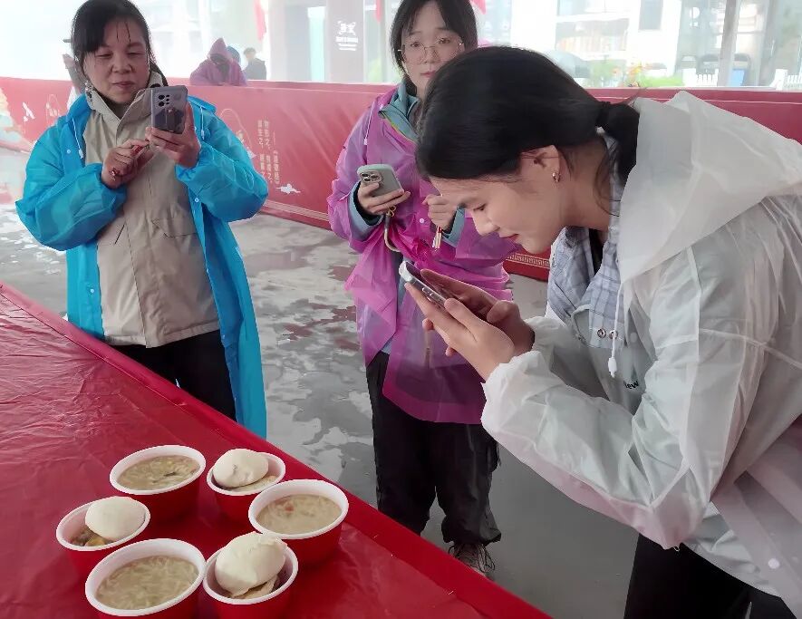 面对假期持续的雨水天气,景区连夜在中天门广场用餐区搭建起避雨棚,为这场“温暖的约定”撑起了一片晴空。中午时分,雨丝纷飞,但餐台前依旧秩序井然。热气腾腾的糊涂面、馒头、栾川卤豆腐、煎鸡蛋以及黄瓜段和鲜圣女果组成的“元气套餐”,仅需一元便可获得。现场延续着“无人值守、自觉投币、自助找零”的诚信模式,游客们在工作人员的引导下依次购买,投币箱中叮当作响的硬币和纸币,是诚信与善意最动听的交响。
