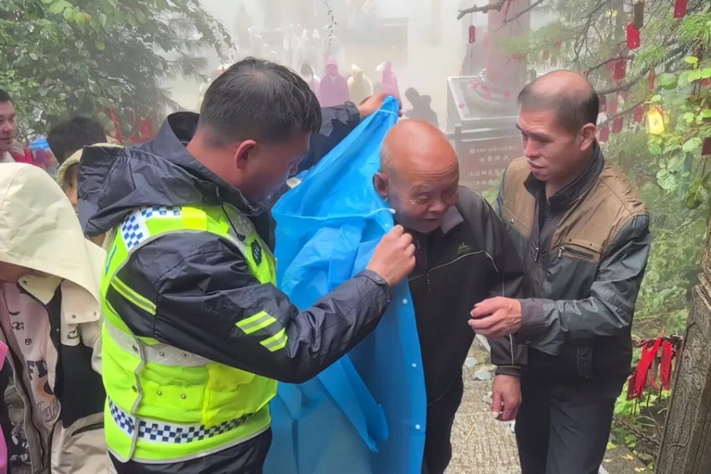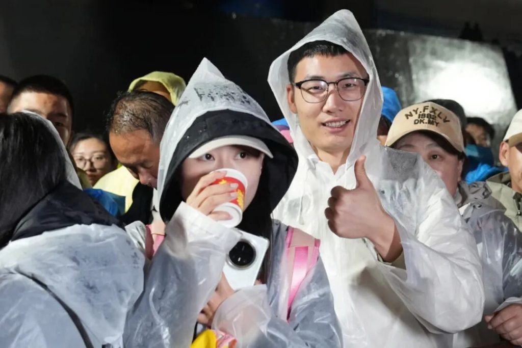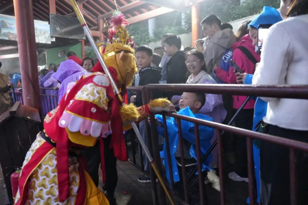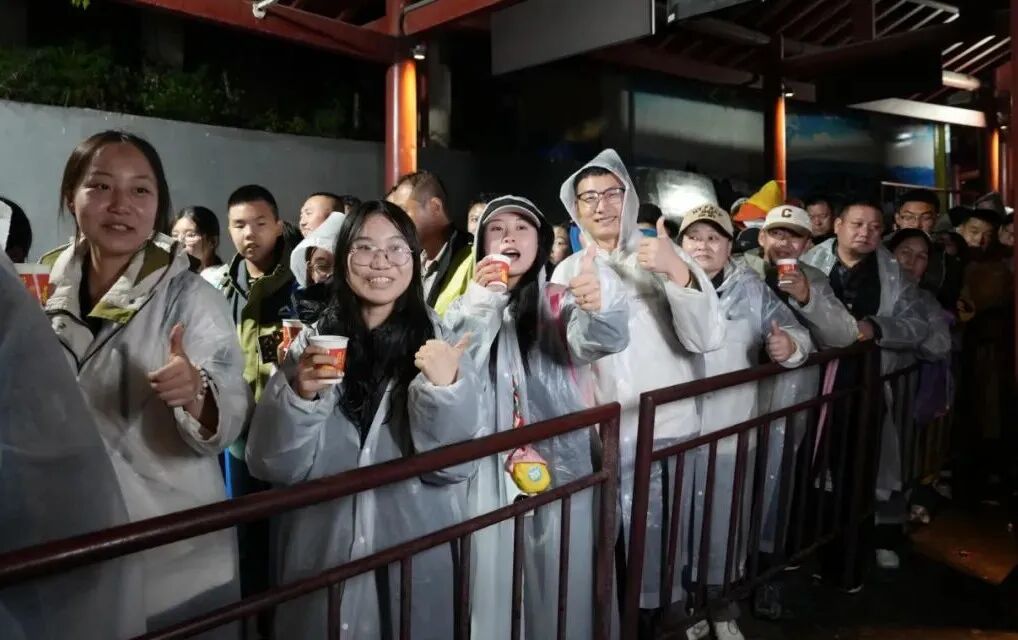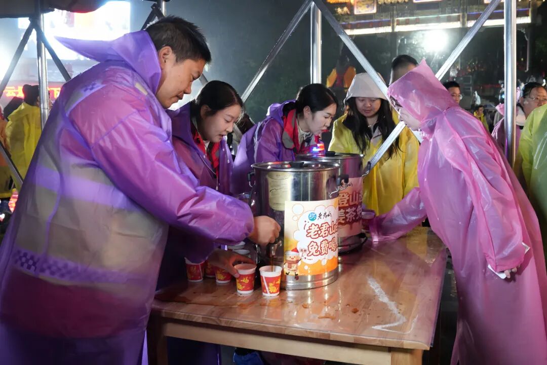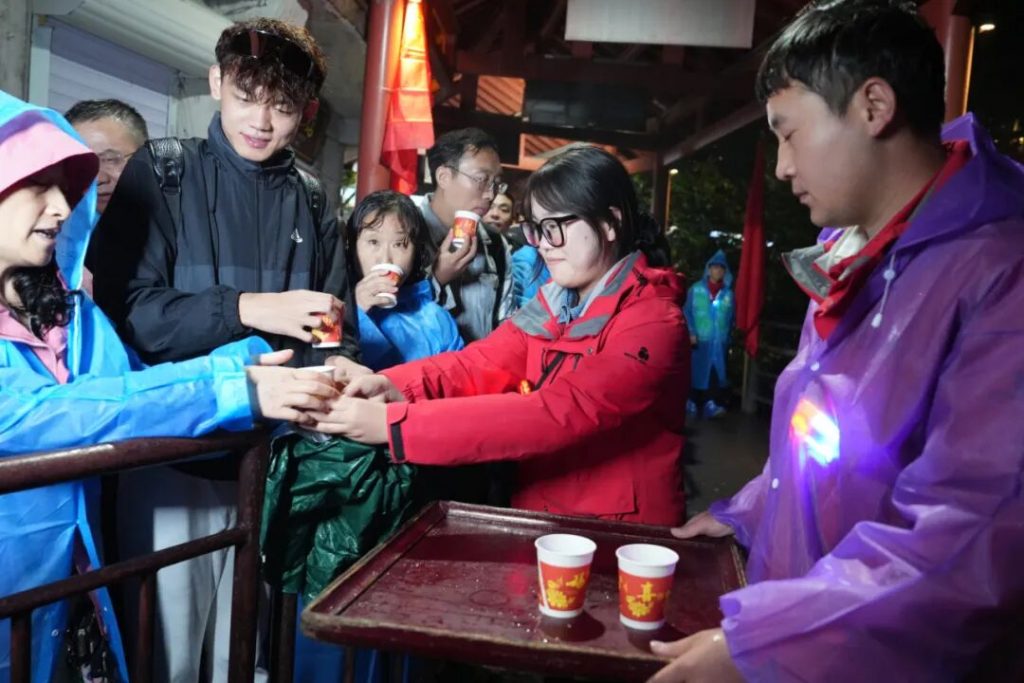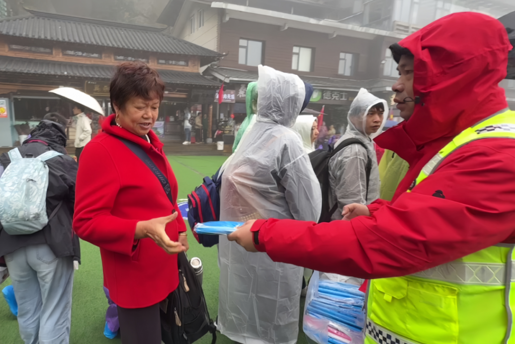 因假期客流密集,许多自驾游客需从远处停车场步行至索道站。为此,景区工作人员特地在沿途为游客送上小礼品。 “虽然下雨,但收到景区送的小礼物,很暖心,点赞!”一位来自沈阳的游客开心地与大家分享;“在下雨天能收到老君山送的小礼品和雨衣,很贴心,为老君山点赞!”;“老君山的服务设施很好,保障得非常到位,很开心!”一份份小小的礼物,承载的是老君山对游客们深深的谢意与祝福。 在索道下山排队区域,长长的队伍本是对耐心的考验,却因一支“老君山欢乐小分队”变成了流动的舞台。工作人员自发组织表演,与游客热情互动。 喷火表演的员工化身“非遗传承人”,烈焰在雨幕中划出绚丽弧线,引得游客阵阵惊呼。“孙悟空”则手持金箍棒穿梭在人群中,与小朋友击掌互动、摆出经典造型,逗得孩子们笑声不断,让等待的时光变得热烈而难忘。 秋雨中的十里画屏,最美的不是山水,而是人。景区工作人员怀抱雨衣,沿湿滑山道快步前行,只为将一件件雨衣送到未带雨具的游客手中,并叮嘱他们注意安全。当雨衣披上身,游客脸上的忧虑化为惊喜与感动。风雨中匆忙的荧光色身影,与游客身上鲜艳的雨衣,共同绘成了老君山这个秋天最温暖的风景。 一位带着孩子的母亲表示:“工作人员浑身都湿透了,却还想着给我们送雨衣,真的很感动。”网友们纷纷点赞:“老君山的贴心果然名不虚传,能为我们遮风挡雨。” 秋雨带来寒意,在下山排队区域,我们深知漫长的等待需要更多温暖支撑。为此,景区迅速熬制了温热驱寒的红糖姜茶,由工作人员一杯杯送到游客手中。 “一下山就能喝到热乎乎的姜茶,感觉整个人都暖和了,你们想得太周到了!”一位双手捧着姜茶的游客感动地说。这杯及时的姜茶,暖的是手,传递的是我们发自内心的关怀。 “十一”假期已经过半