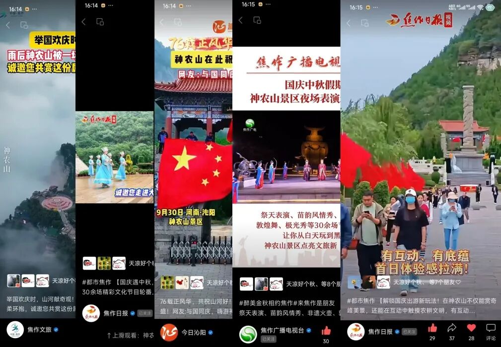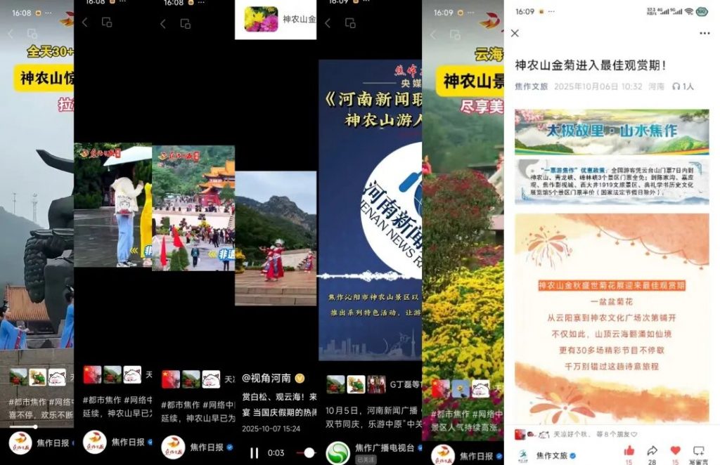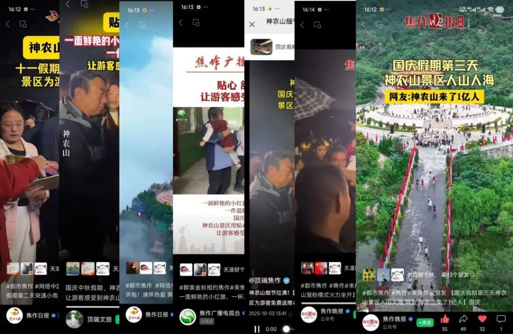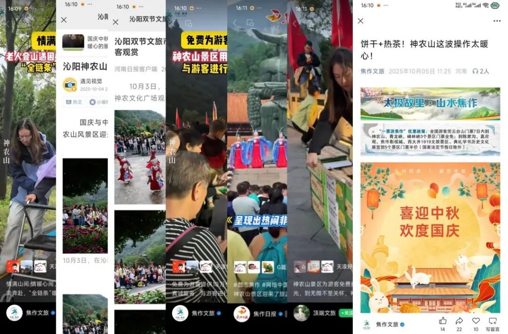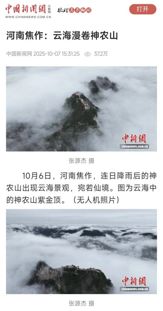 国庆的神农山,被 “中国红” 层层包裹。游客服务中心的小红旗长廊舒展耀眼,景区里的国旗与菊花相映成趣,连游客手中挥动的小国旗,都汇成流动的红色浪潮。每一抹红里,都藏着对祖国最赤诚的庆生告白。 国庆假期,神农云海多次惊艳登场。清晨登至紫金顶,云雾从山谷间漫出,峰峦化作 “海中岛屿”,龙脊长城在云海中若隐若现。游客随手定格,便是刷爆朋友圈的 “仙境大片”,不少人感叹:“国庆能遇此奇景,这趟旅途太值了!” 30多场演出承包了国庆的热闹。神农祭天舞展文化厚重,苗韵风情秀带互动欢腾,非遗变脸引满堂惊呼;“孙悟空”“卖货郎” NPC 穿梭送惊喜,猕猴苑 “小人国表演” 逗笑全场;夜场敦煌舞、极光秀轮番上演,让每个瞬间都浸着国庆的欢乐。 雨天递上免费雨衣,休息站送上热乎百草茶,索道口工作人员弯腰抱孩子进轿厢,夜场结束递上暖心小面包…… 公安巡逻、医护值守、员工贴心服务,这些细碎的温暖,成了游客心中比风景更难忘的国庆印记。 国庆期间,神农山的魅力获主流媒体争相报道:央媒中新网专题发布神农山云海奇景,绝美画面引全网惊叹。 省级媒体河南日报、顶端新闻等聚焦景区国庆盛况;焦作本地媒体焦作日报、焦作晚报、焦作广播电视台更是多角度报道,从醉人美景、精彩节目到贴心服务,全方位展现神农山的国庆风采,让全国看见这座山的独特魅力。 但神农山的秋日精彩才刚刚启程。
