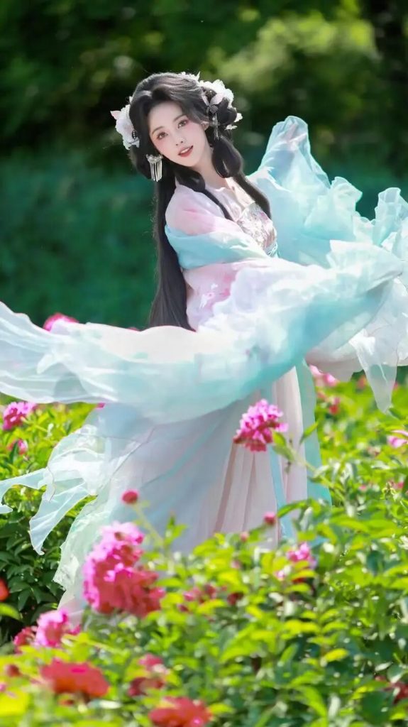 她们身着缀满花瓣的纱裙,