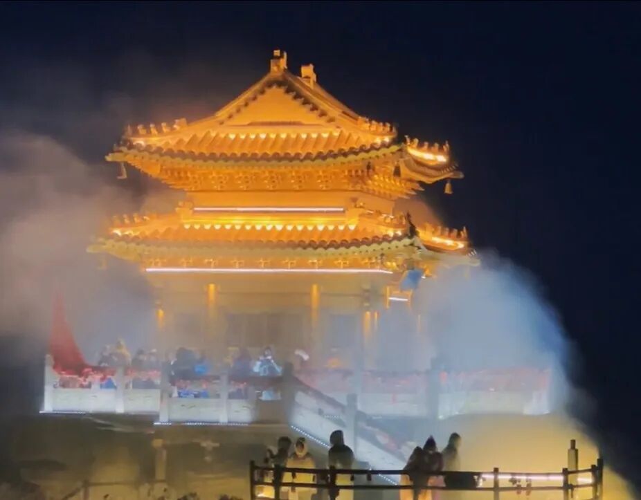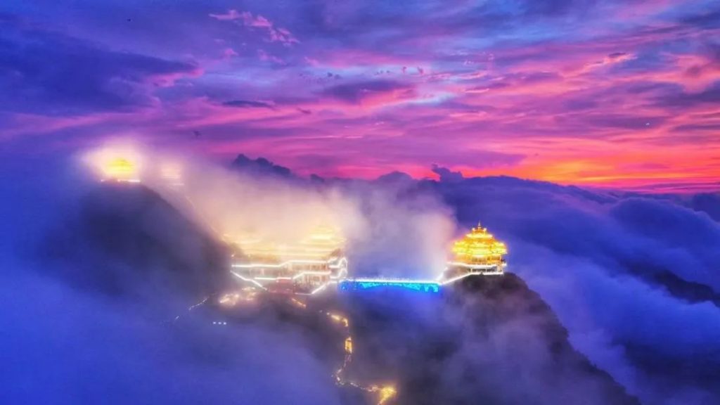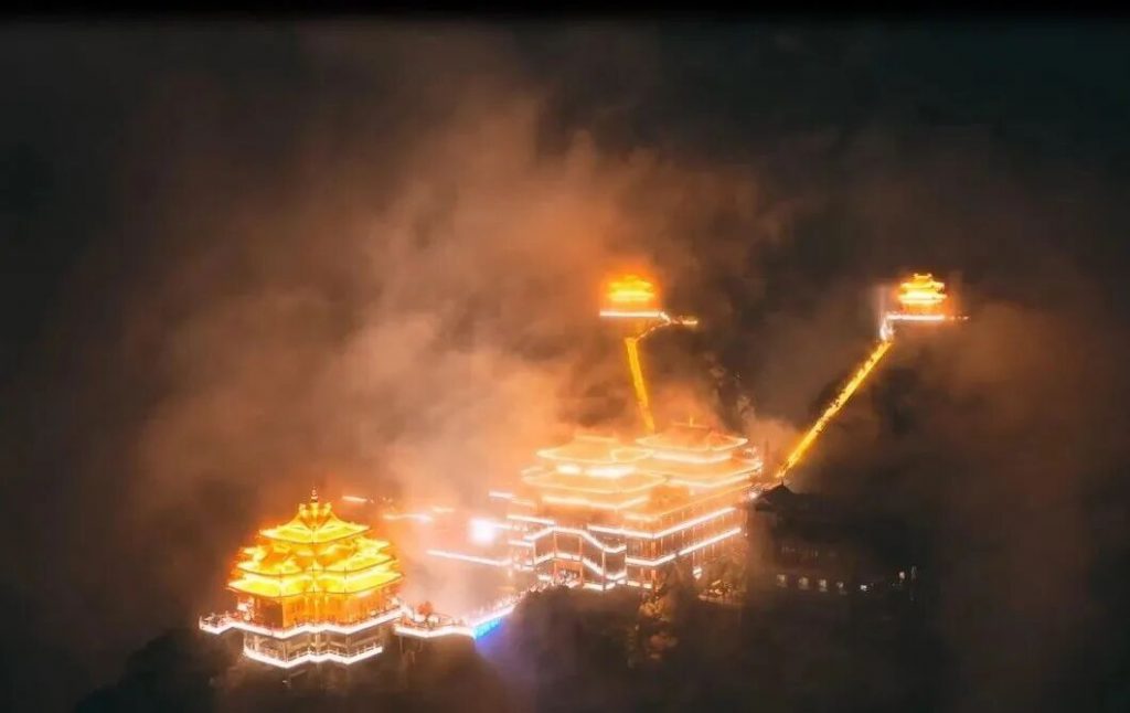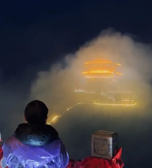 而这趟仙境之旅的华彩乐章,将在夜晚上演。雨雾非但没有削弱夜景的魅力,反而成为了最好的“造梦师”。灯光在雾气中形成梦幻光晕,整座金顶建筑群宛如悬浮于九重天之上的天宫,仙气缭绕,震撼无比。