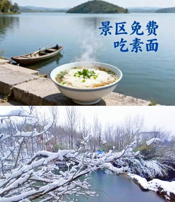 澄澈的潭水与纯白的雪花相映成趣