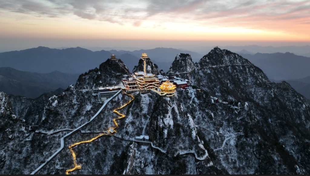 当日落余晖散尽,夜空成为背景板时——刹那间,灯火齐明!金色的光芒勾勒出金顶道观群的巍峨轮廓,在深邃的夜空中璀璨夺目,宛如一座真正永不落幕的天上宫阙。