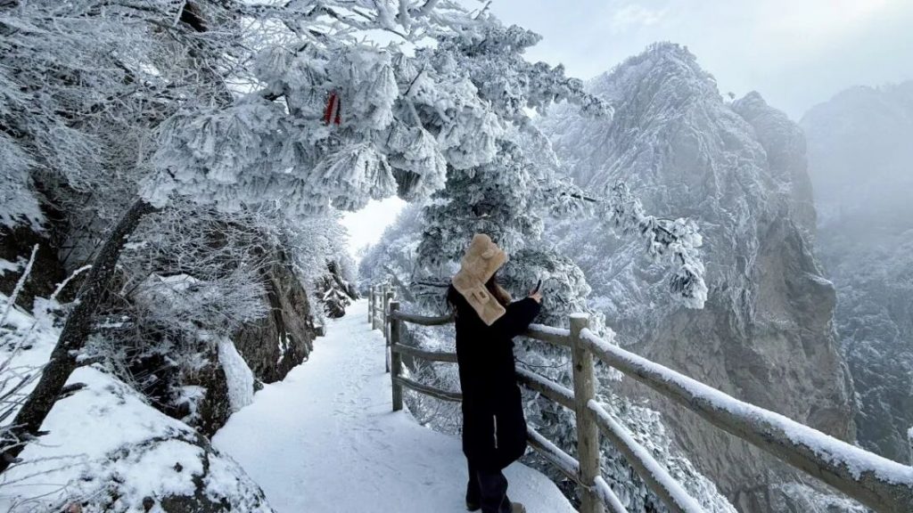 白天,漫步在栈道上,玉树琼枝,冰雕雪琢,十里画屏变身成为巨大的冰雪艺术长廊。每一步,都仿佛在云端漫步,每一步,都是一张绝美的风景明信片。