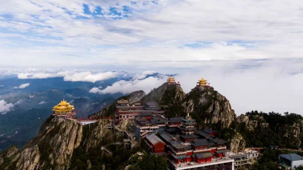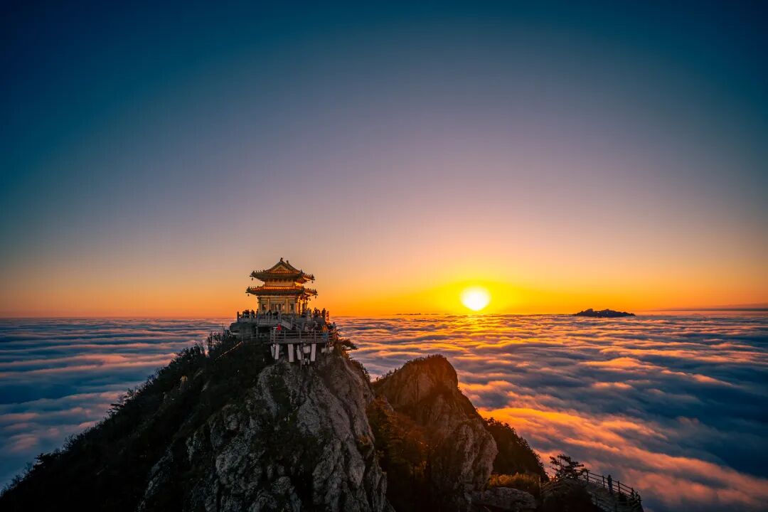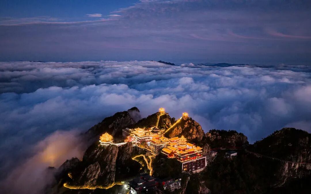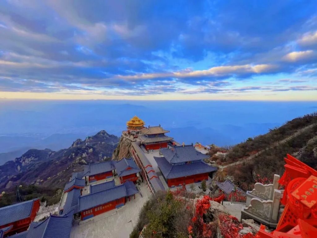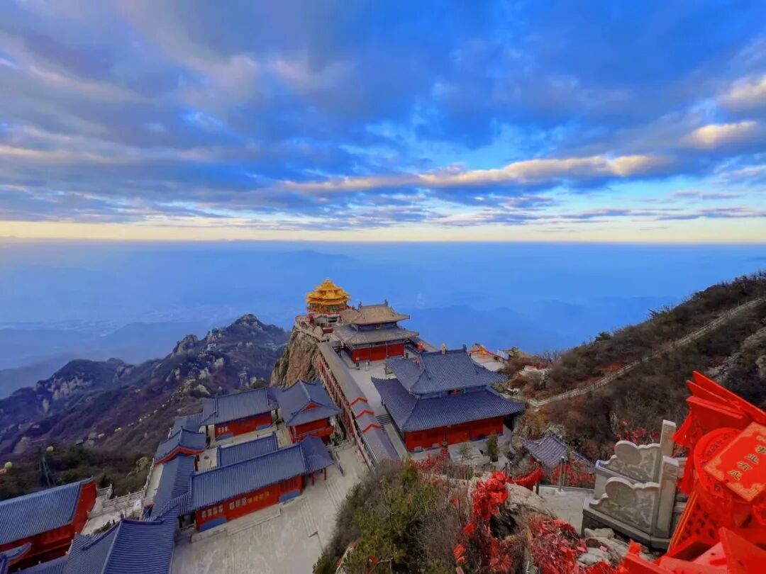 干燥的北风带来了万里无云的“老君山蓝”。此时的天空像被洗过一般,湛蓝如水晶。摄影爱好者们,这是拍摄金顶道观群巍峨身影与清晰山脊线的黄金时间,每一帧都纯净得可以做壁纸。