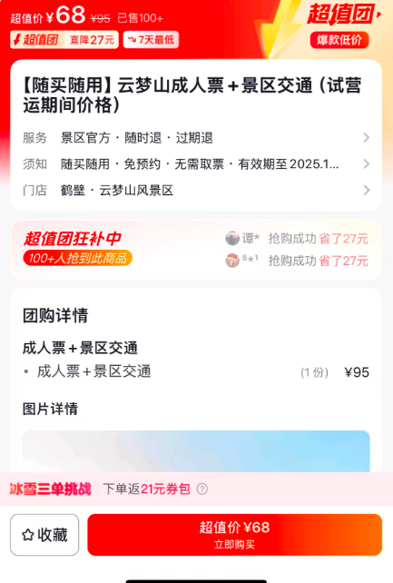 方式3:在美团、抖音等平台购买景区套票(含门票与观光车票)后,凭订单二维码扫码即可入园及乘车;