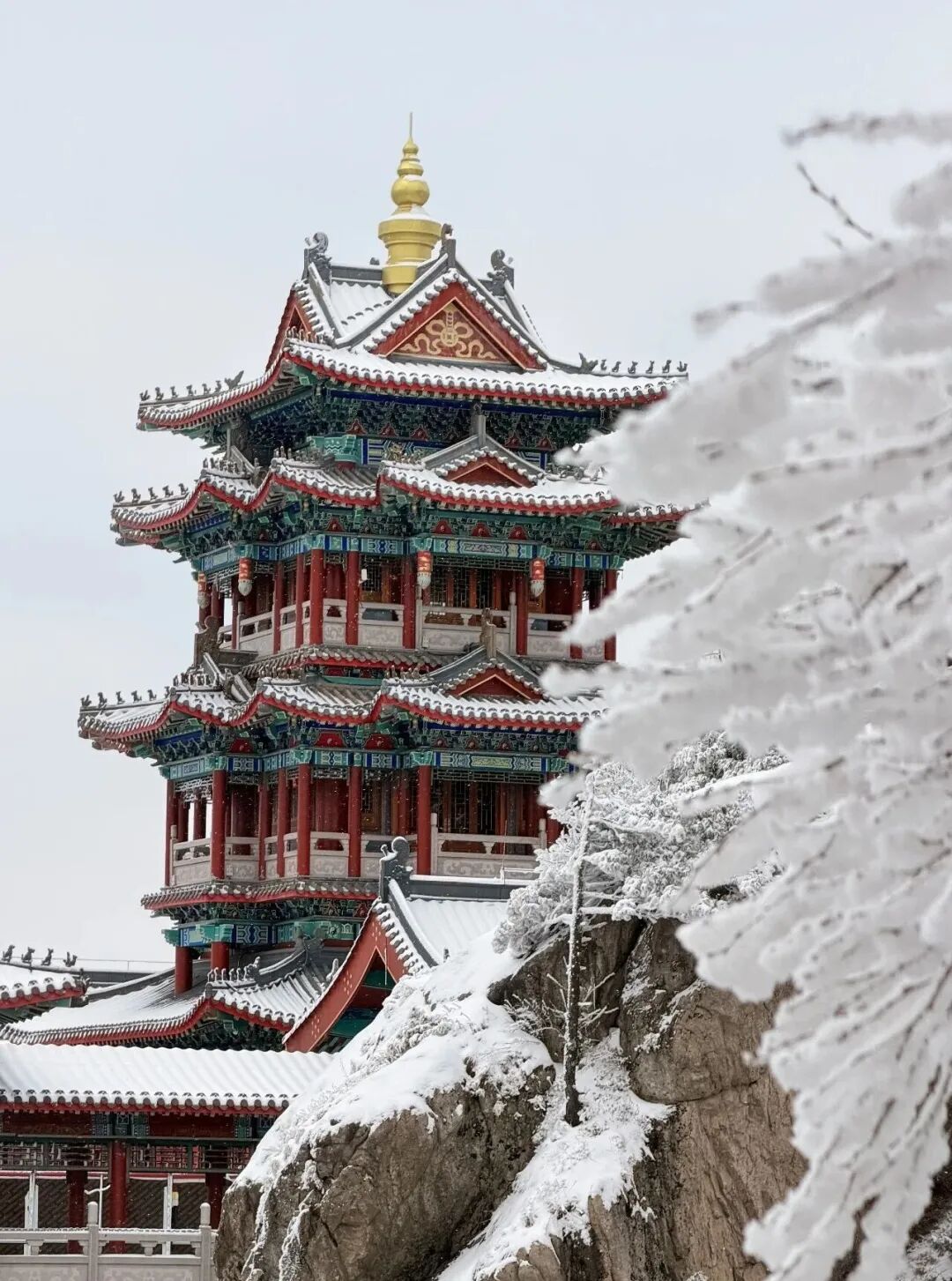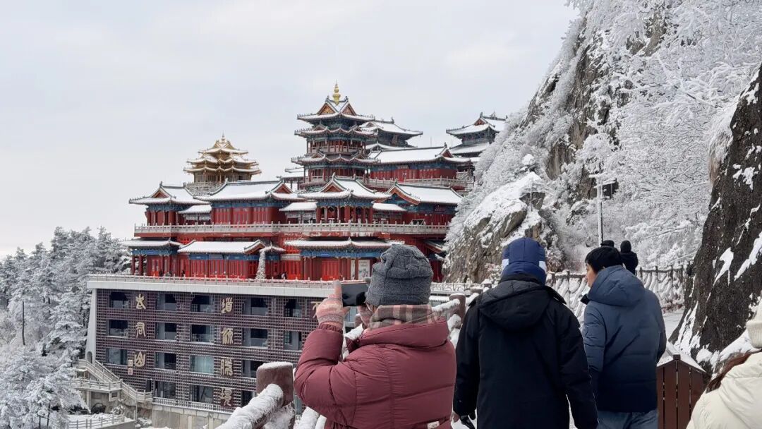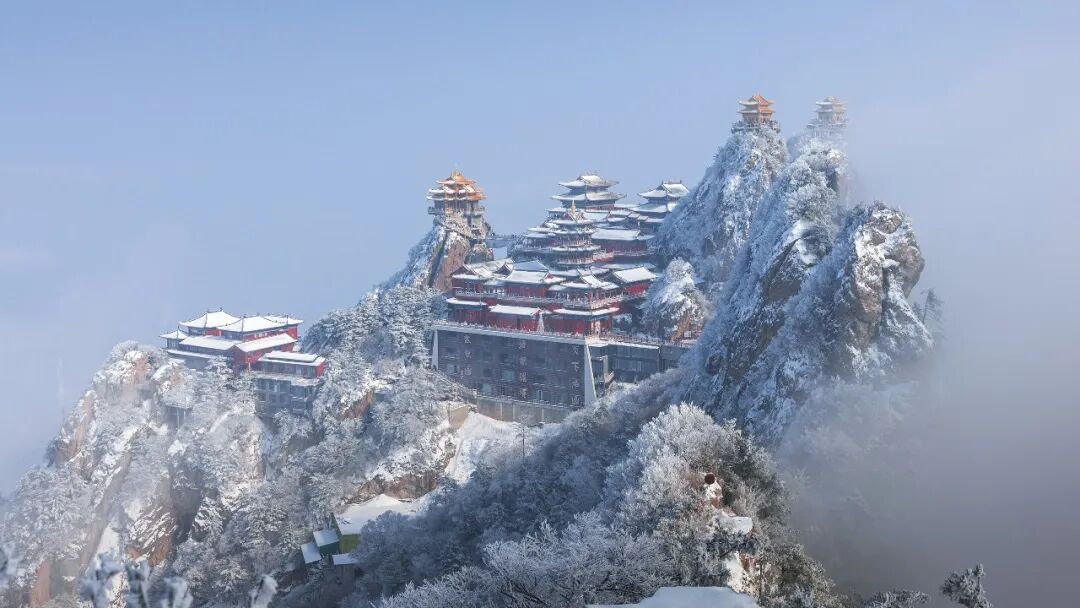红墙金瓦的道观殿宇被皑皑白雪温柔覆盖,屋檐下悬挂的冰凌晶莹剔透,道观与雪景相映成趣,禅意与仙气交融。