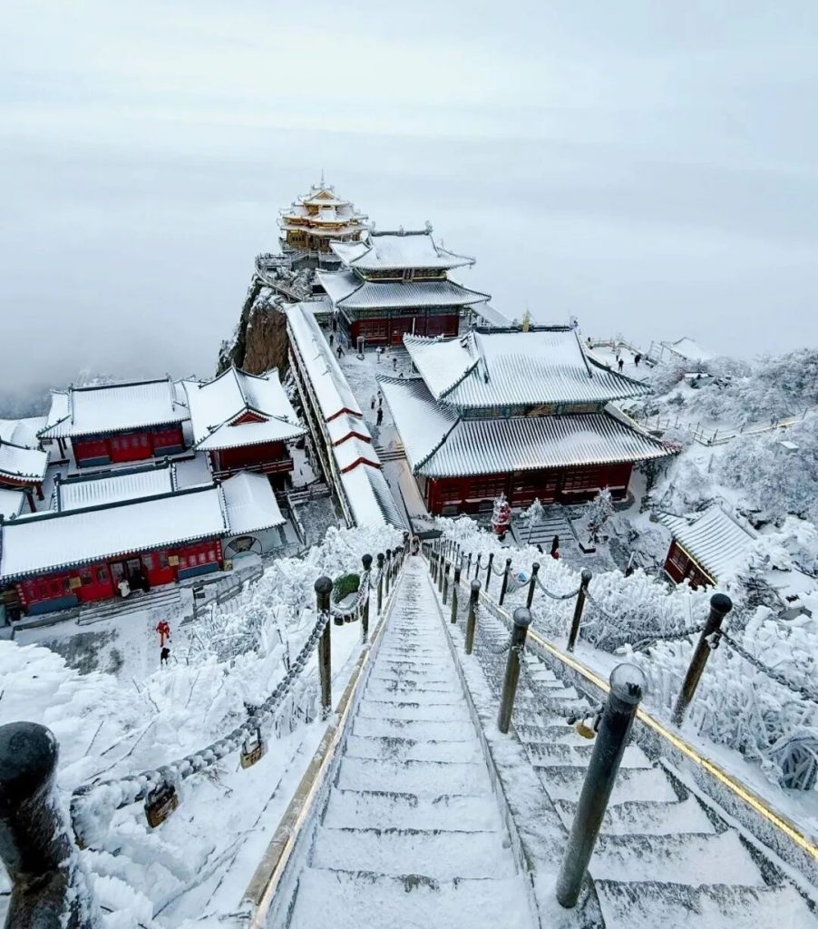 如遇雪后初晴天气,云海翻涌,金顶在云海与白雪的衬托下,更显庄严神圣,仿佛真的通往仙境之门。