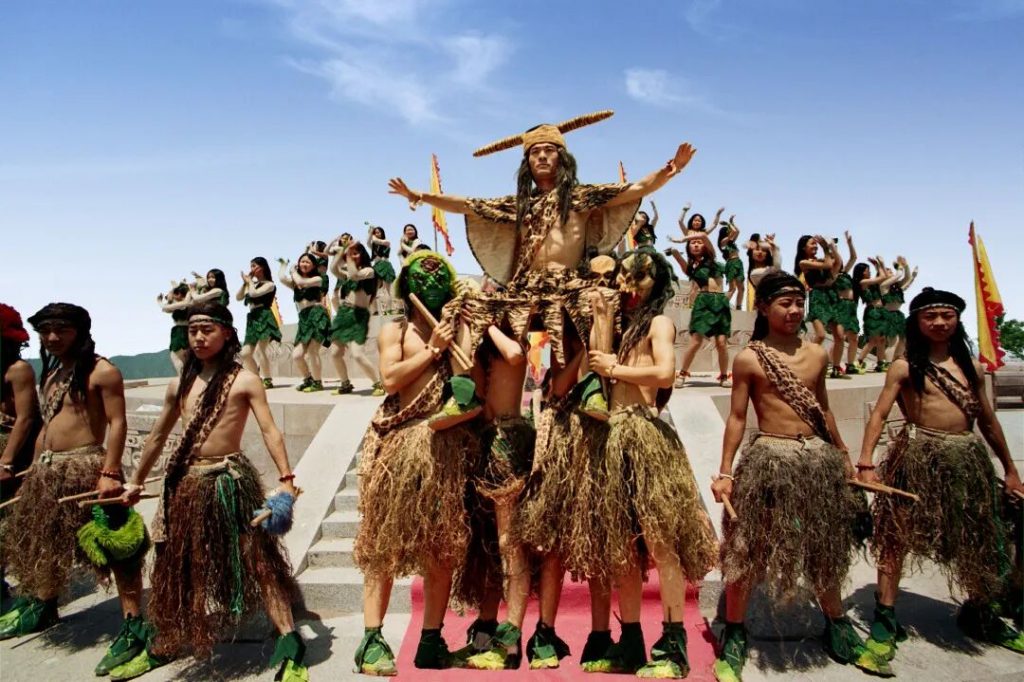 开山迎春・神农赐福舞蹈秀:身着华丽服饰的演员化身“神农使者”,伴随击鼓鸣钟之声起舞,华光流转间尽显远古农耕风情。
