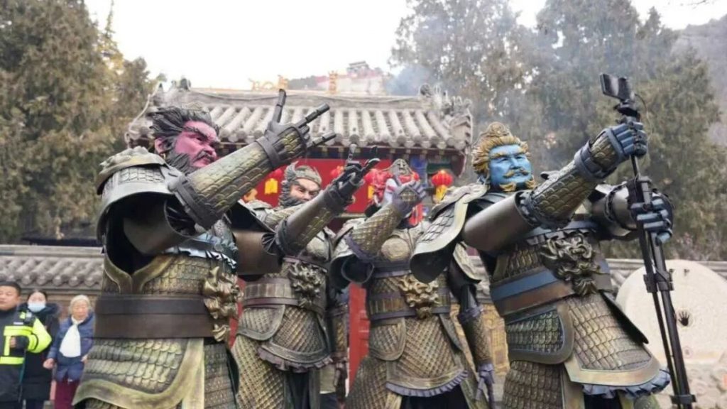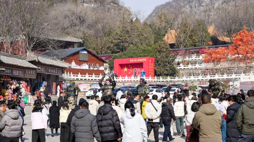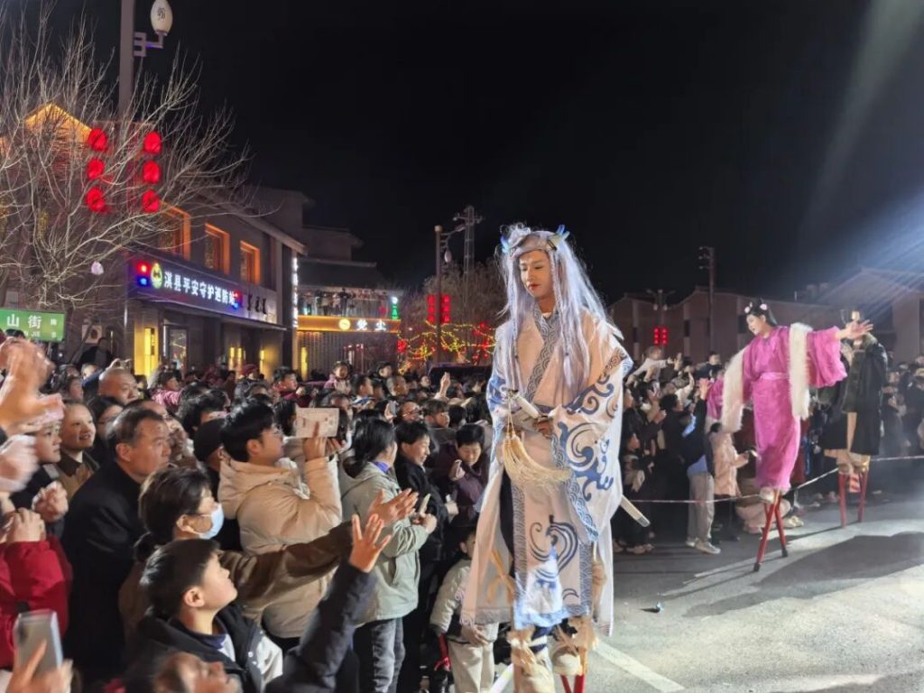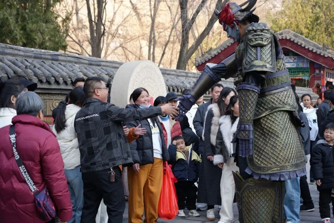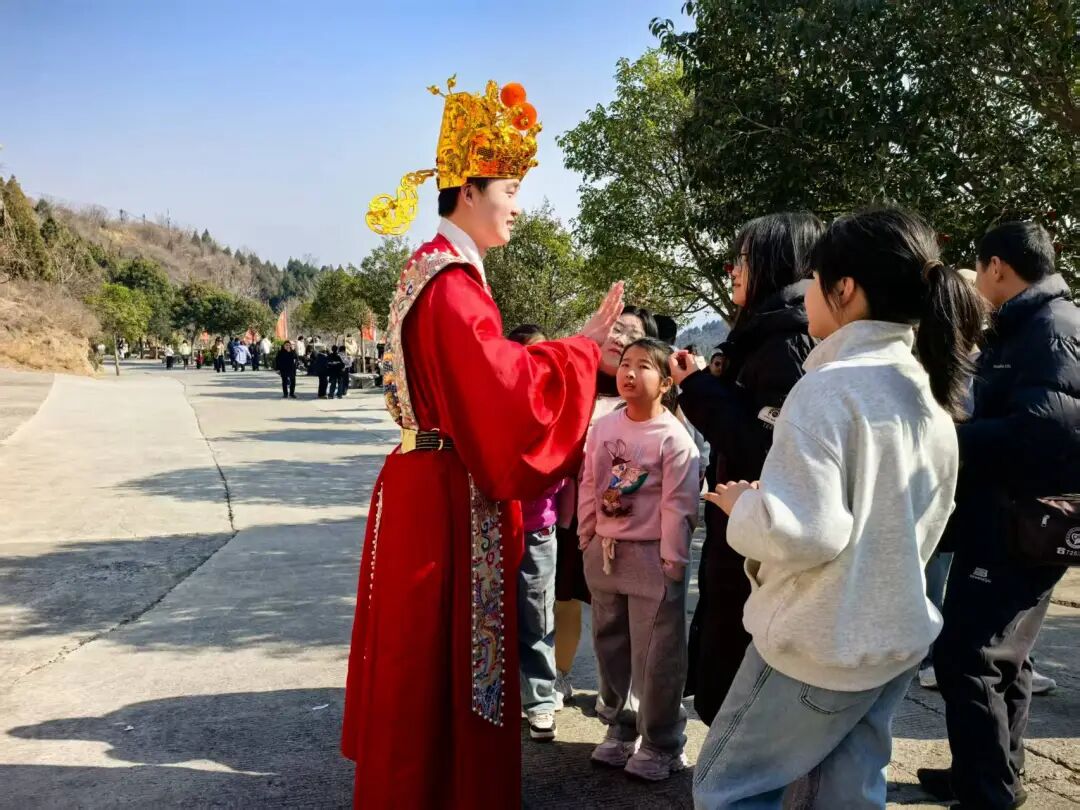 古灵山景区人气爆棚,沉浸式演绎轮番上演,祥瑞氛围拉满。女娲赐福、财神送宝、魔家四将机甲巡游惊艳亮相,各路瑞祥角色与游客亲密互动,争相合影定格美好瞬间。