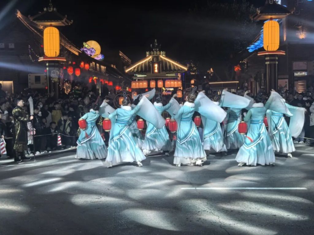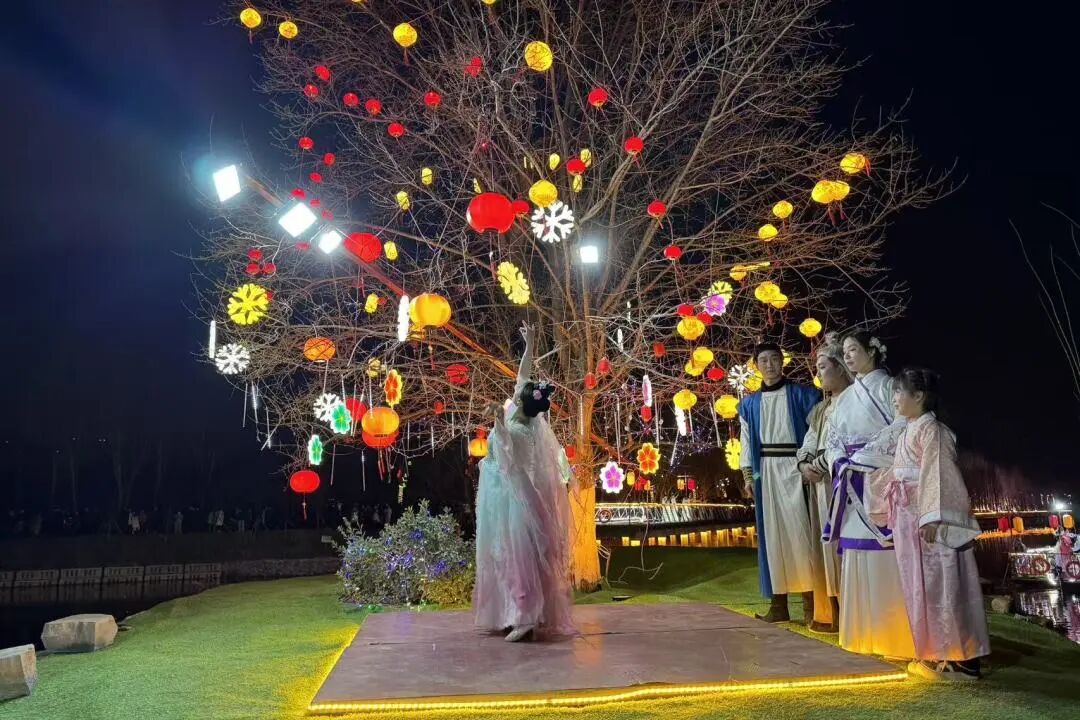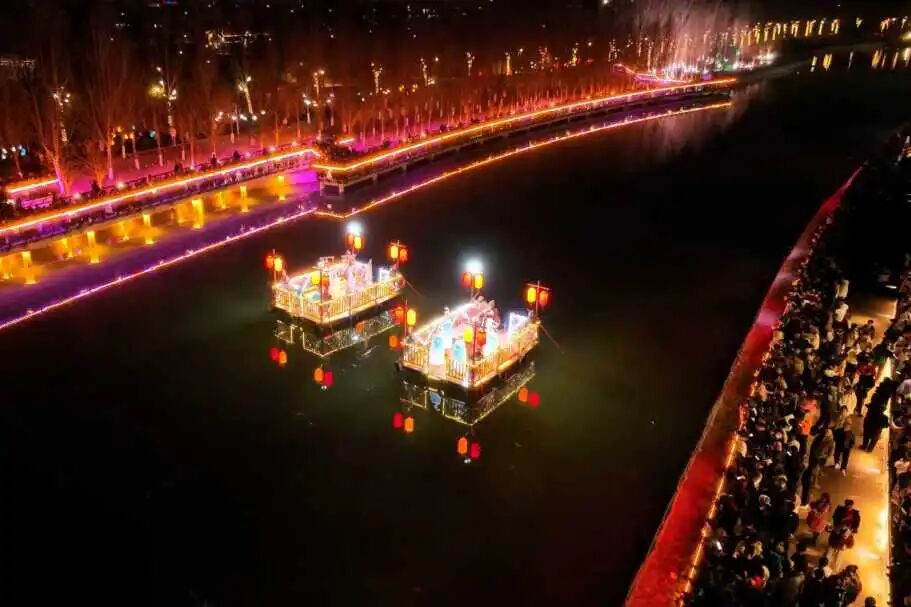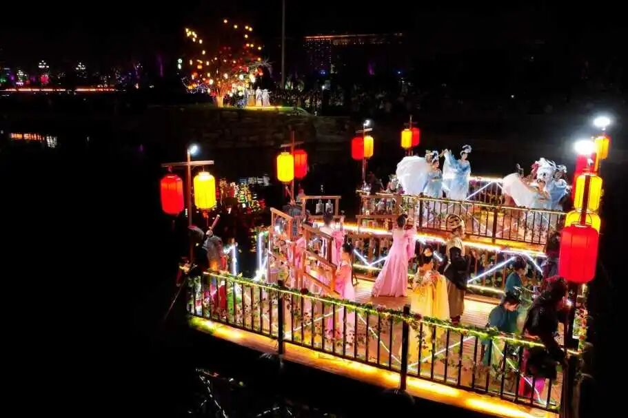 晚上8:30,花船巡游震撼启幕成为全场焦点!画舫缓缓驶过沬水河畔,璀璨灯光、悠扬音乐、曼妙舞蹈相映成趣,把沬水河畔打造成最梦幻的新春舞台,两岸人山人海,热闹非凡。