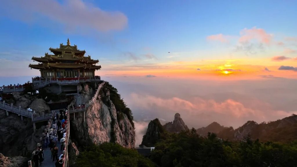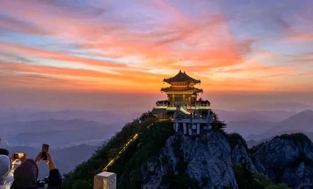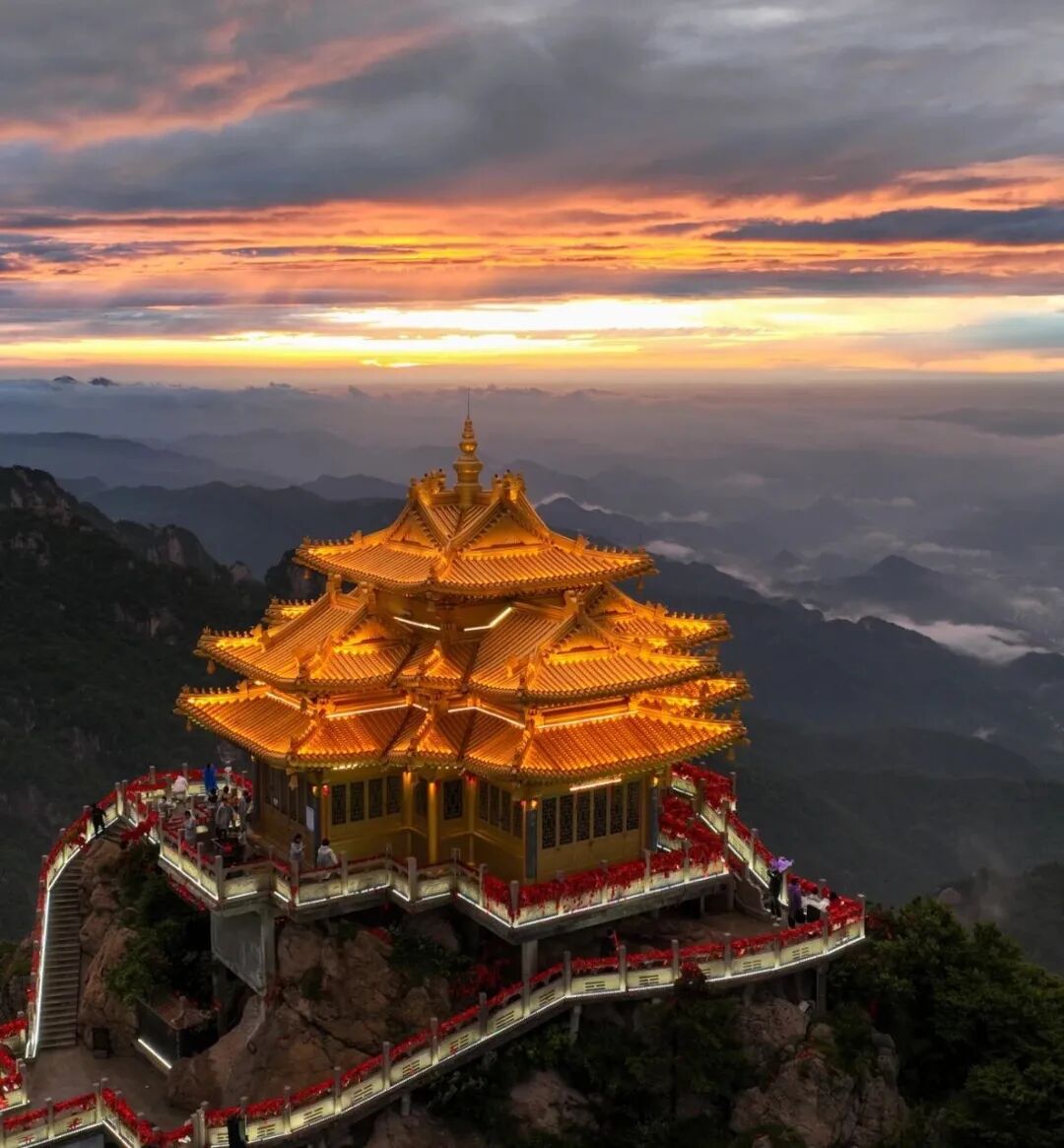 当最后一缕夕阳落下,金顶的灯光次第亮起,朱红的墙、鎏金的飞檐在夜色中格外醒目,与天上的落日遥遥相望。