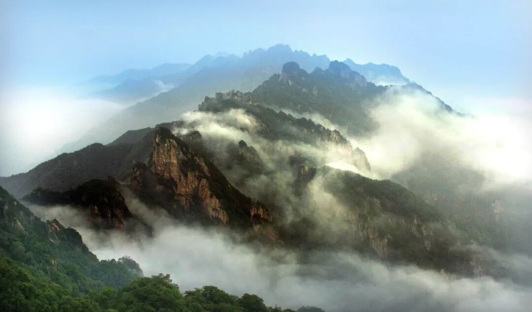 此时的山色,是被春风晕染的“青绿山水图”。褪去冬日的银装,老君山的峰林慢慢苏醒:松柏抽出嫩绿的新芽,给黛色的山峦镶上灵动的花边。