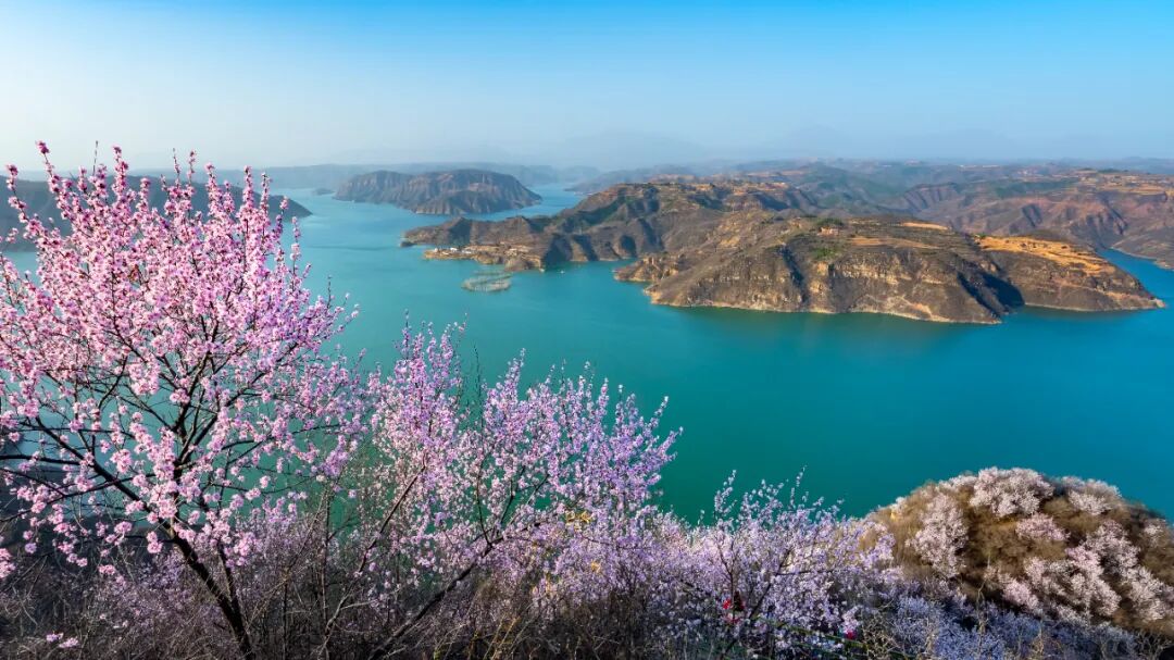 在央视新闻的镜头中,荆紫仙山的山桃花竞相绽放,粉白相间的花瓣缀满枝头,微风拂过,落英缤纷,宛如仙境。远处黄河如带,蜿蜒流淌,与近处的花海、古朴的山峦构成了一幅“人在画中游”的绝美图景。