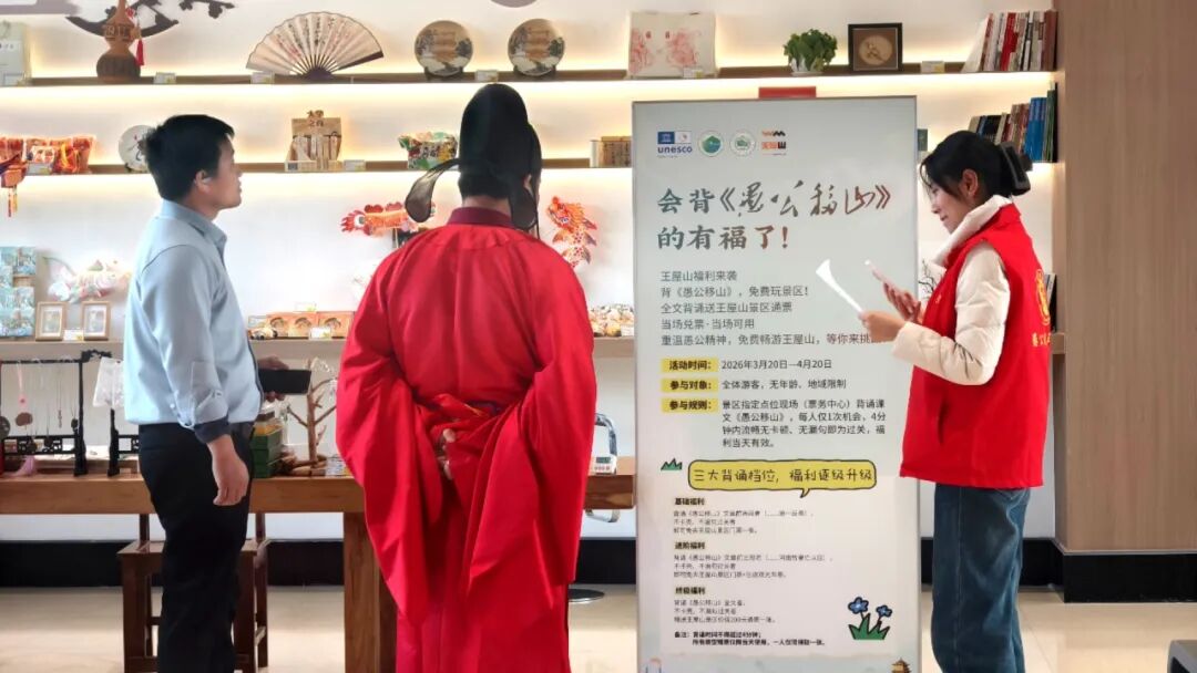 背诵课文《愚公移山》免票活动正在火热开展中,2026年3月20日至4月20日,所有游客均可参与背诵挑战,4分钟内流利背诵,即可解锁免门票、免门票 + 观光车票、赠200元通票等福利,当场兑票当场用,零门槛全民可参与,不少游客带着家人孩子前来挑战,在诵读经典中感受愚公精神,成为景区内一道独特的风景线。