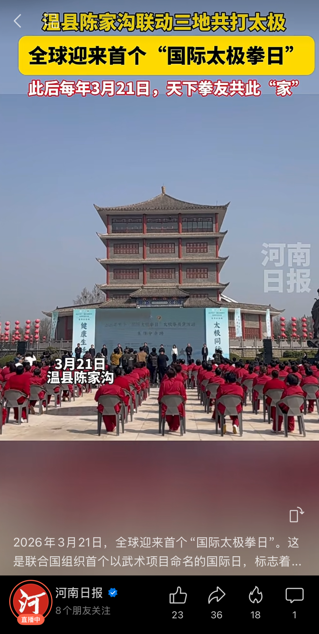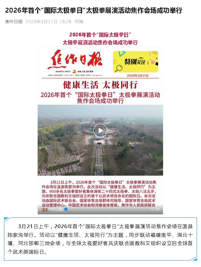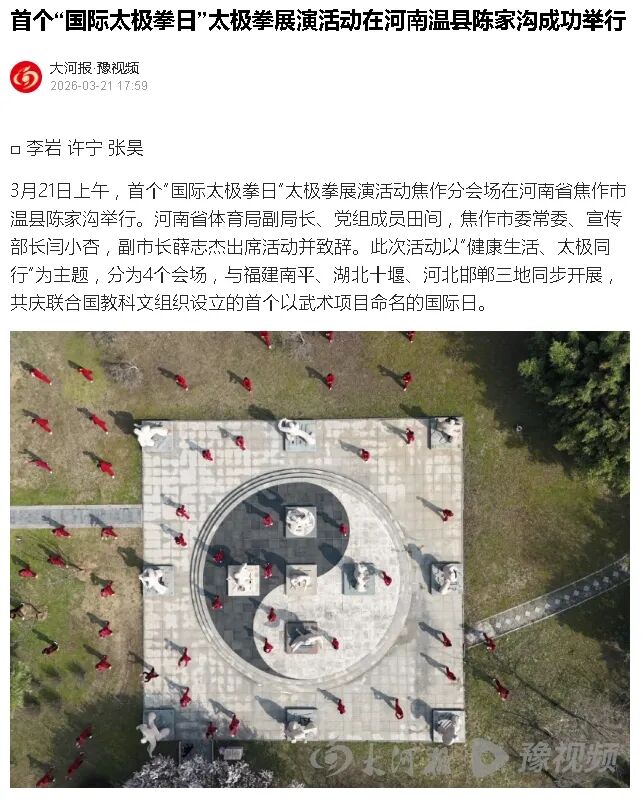 转载请注明来源:风光网视 » 首个“国际太极拳日”火爆全网,温县(陈家沟分会场)再次登上“C位”→