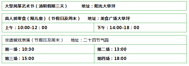 ①:非遗猴戏表演②:大型风筝艺术节(清明3天)