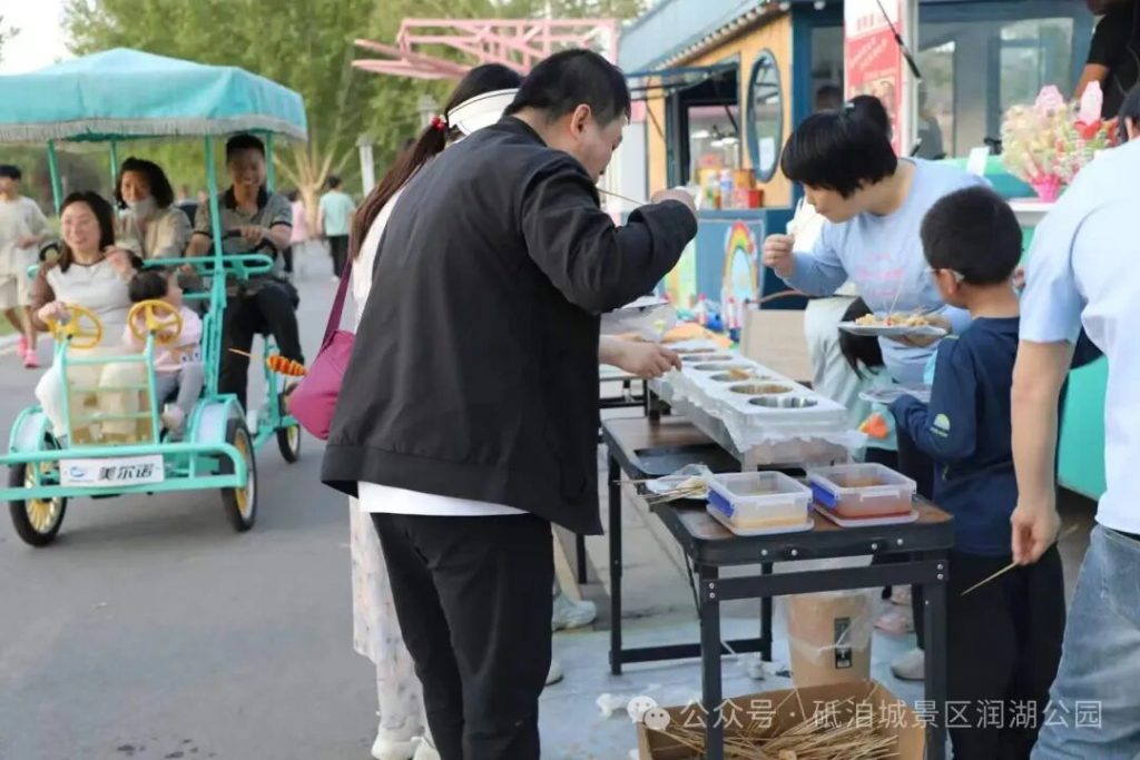 更有网红与舞蹈团队现场直播互动,线上线下同步狂欢,让传统戏曲潮玩出圈,让非遗文化走进年轻人心里。 除此之外,古堡内还有机器人与机器狗趣味互动、张敦仁故居国学沉浸式体验,投壶游戏、天元术解谜、书法临摹等趣味项目,让亲子家庭、研学游客在游玩中感悟历史、学习知识,解锁古堡的多重玩法。 依水而兴的润湖公园,是五一假日放松休闲的绝佳去处。 5月1日-4日,每天下午,经典晋剧在花朵集市开唱,听一曲三晋古韵,享一段悠然时光。 五一期间,花朵集市火热开启,诚挚欢迎各地特色美食、风味小吃、茶饮甜品等优质商家入驻,与我们共同打造假日美食盛宴! 还有露营大会・轻奢营地惊喜上线,不用装备、无需准备,一键开启慵懒户外时光,拍照打卡氛围感拉满。 这个五一,三门街摇身一变成为时尚与传统交融的打卡胜地。 优雅旗袍秀惊艳亮相,一颦一笑尽显东方温婉韵味;机器人、机器狗街头互动,邀你共舞;大濩・伍次方舞蹈团动感舞姿点燃街区氛围,慢享古街烟火治愈感。 没有拥挤人潮,只有悠闲惬意,三门街用最温柔的方式,呈现假日该有的模样,随手一拍都是国风大片,漫步其间,感受时光慢下来的美好。 这个五一,不必远走