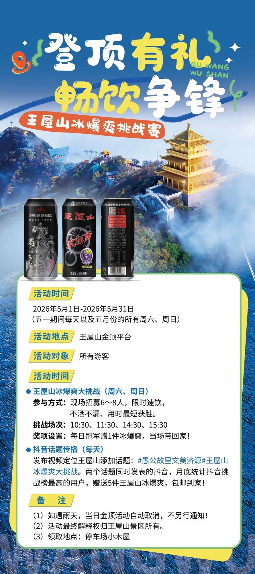 王屋山冰雹爽大挑战火热开启,线上线下同步欢乐!线下参与挑战解锁清凉嗨玩体验,奖品即刻带回家;线上打卡发布,赢取景区专属好礼!趣味互动+惊喜福利,承包你的五一欢乐时光!